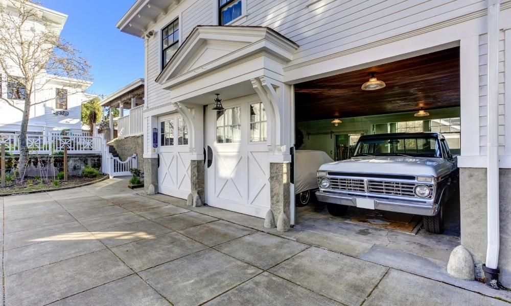 Home › Fort Worth, Dallas & Denver Garage Door Installation Photos › General › a white car parked in front of a white building. features garage door services garage door repair garage door installation garage door spring repair provided by Retrak Door Service.
